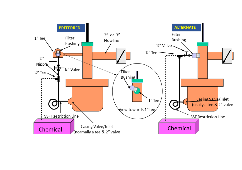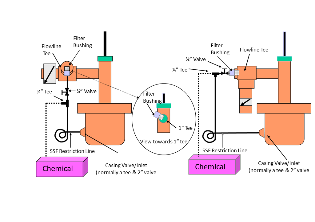 † Filter bushing is usually located between horizontal and vertical (on top of flowline tee) and not on bottom of flowline (top half of line or tee).
